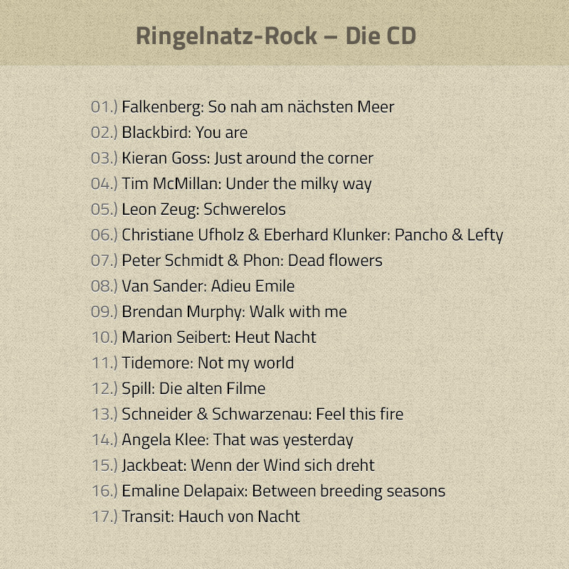 „Diese CD ist einfach einzigartig! Es freut mich sehr, dass sich so viele Künstler, die bei uns im Ringelnatz aufgetreten sind, bereit erklärt haben, an dieser CD mitzuwirken. Es wurden extra für diese CD neue Songs aufgenommen und das macht mich sehr stolz.“ sagt Norbert Ripka über die CD.